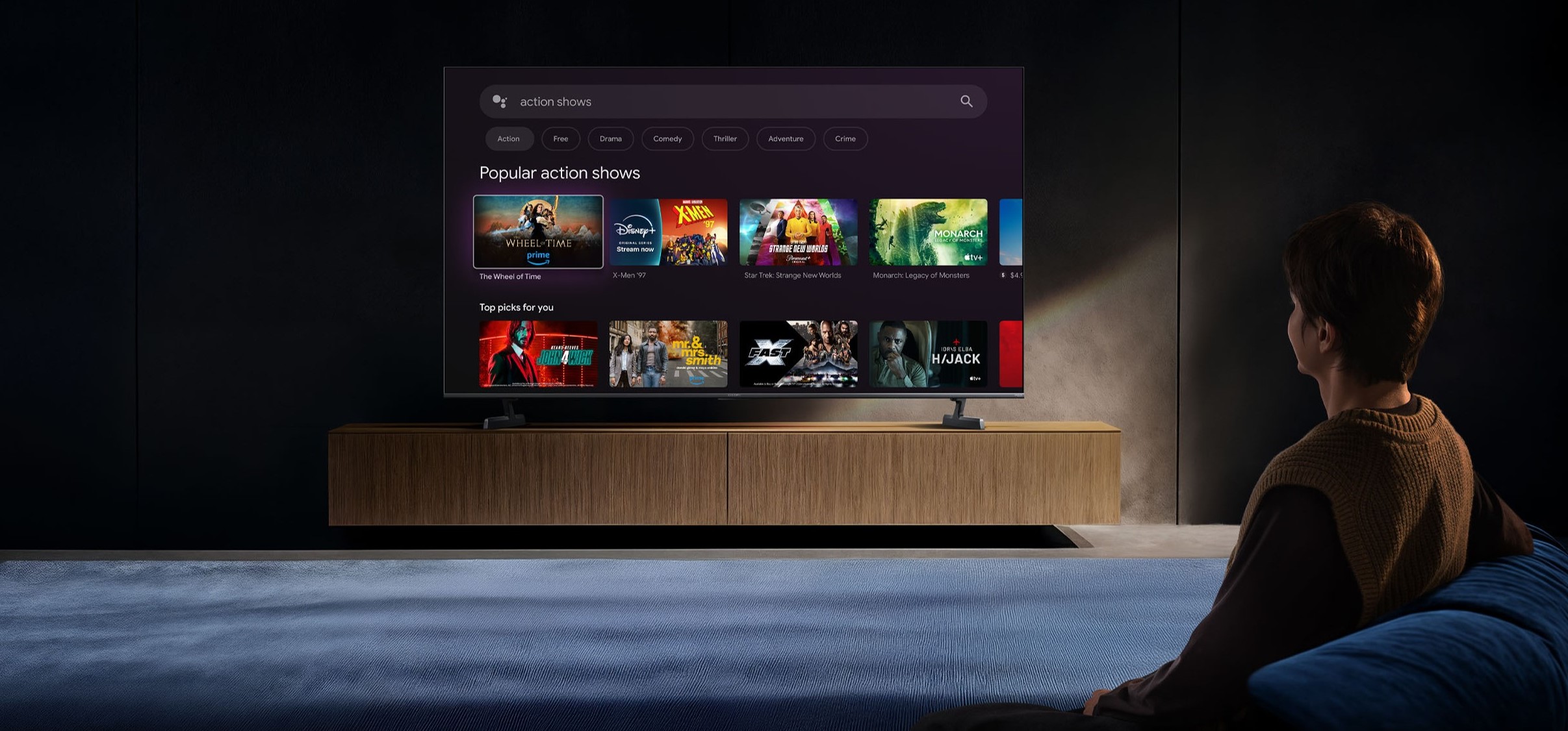 Телевизор поддерживает современные форматы HDR, включая HDR10, HLG и Dolby Vision, что улучшает передачу цвета, контраста и деталей. В качестве программной платформы используется Google TV, предоставляющая доступ к приложениям, стриминговым сервисам и голосовому управлению через Google Ассистент.
